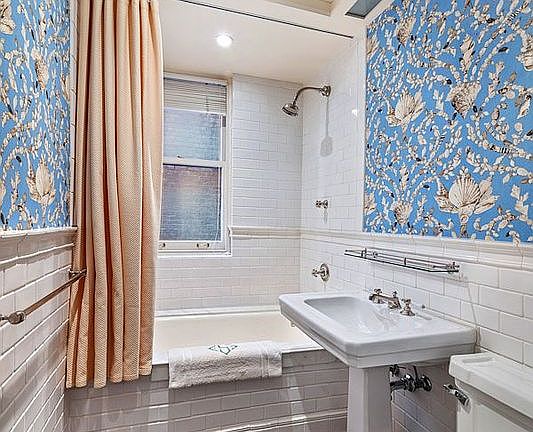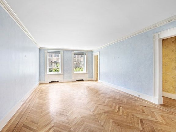The primary bedroom has 2 large paned windows facing south and west. The second bedroom with en-suite bath is quietly located on the west side of the building. Both bathrooms are decorated with beautiful wall coverings and throughout this elegant home are hand painted finishes. The apartment is equipped with an eat-in kitchen featuring a flexible floorplan for dining or office space. Pre-war details throughout include 9.5 foot ceilings, original plaster moldings, and beautifully paneled Georgian doors.
