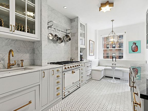 The beautifully renovated kitchen and sunny breakfast area feature custom cabinetry, Bardiglio and Carrara marble countertops, and premium appliances: a Fisher & Paykel dishwasher, under-counter KitchenAid refrigerator, and a five-burner CornuFe stove by La Cornue. The kitchen also boasts a custom built-in banquette with generous storage, creating a warm and functional space for casual dining. The open flow between kitchen, breakfast area, and living room creates a perfect setting for entertaining.