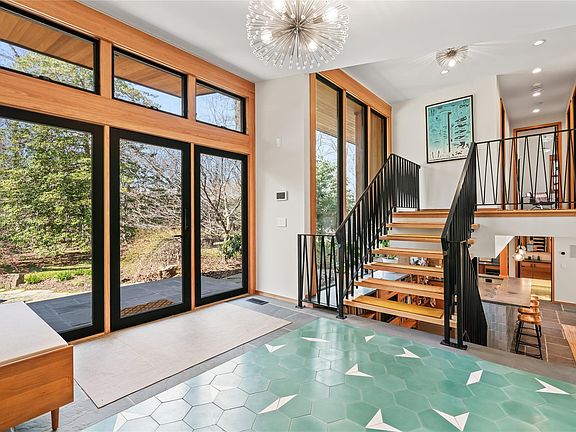 Inside, the home offers four bedrooms and 3.5 bathrooms. The bright and spacious entry foyer welcomes you into the living room with floor to ceiling windows connecting with the natural surroundings. The expansive eat-in kitchen is a chef's dream, outfitted with top-of-the-line appliances, a 5-burner cooktop, double wall oven, and a butler's pantry with an additional sink and dishwasher. The open dining area is ideal for hosting, with seamless flow into the adjoining living space. From the spacious and comfortable family room is a mudroom with access to the attached 2-car garage equipped with 2 electric fast chargers for everyday convenience.