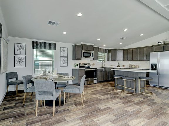 A captivating 1292 sq. ft., 3-bed, 2-bath home with a warm welcome from the covered front porch. Immerse yourself in sunlight with floor-to-ceiling windows illuminating every corner. Enjoy the seamless flow between the living, dining, and kitchen areas. A chic bar island with dark wood cabinetry elevates the culinary space. Highlights include vaulted ceilings adorned with recessed lighting, a farmhouse sink, and modern Whirlpool appliances.