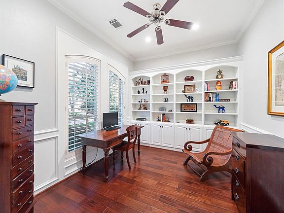 Elegant & luxurious home on a cul-de-sac in the desirable Capstone Forest community! Grand, 2 story entry opens to a beautifully designed floor plan filled w/updates & custom touches. Off the entry, the office features plantation shutters, built-ins, & crown molding. Enjoy entertaining in the formal dining room, which conveniently adjoins the butler's pantry. The updated gourmet kitchen boasts wall-mounted double ovens, Carrera marble backsplash, center island, & breakfast bar. The kitchen is a chef's delight, opening to the breakfast & family rooms, which enjoy gorgeous views of the backyard oasis. Dramatic tray ceilings & bay windows accent the master retreat. The updated ensuite has a custom freestanding tub, Carrera marble shower surround, quartz counters, & his/hers closets. Upstairs includes a spacious game room w/built-ins, 3 bedrooms, Jack/Jill bath, & bonus room w/flex space. The picturesque backyard features a pool/spa, gazebo w/ ceiling fan, & fire pit on the large patio.