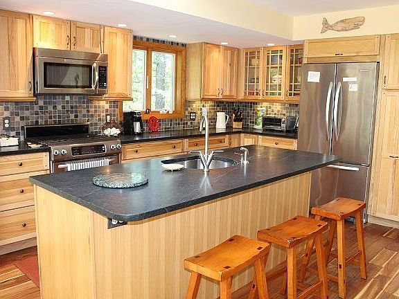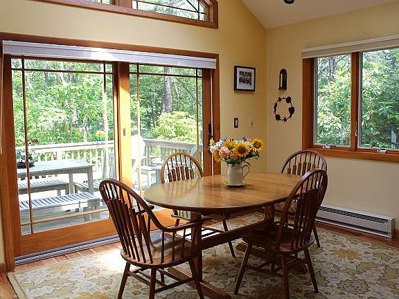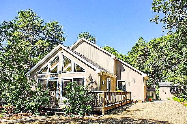 Classic Katama Beach House- This Light filled home is nestled in the Katama woods, yet only a mile and a half to South Beach or downtown Edgartown. The dramatic front of the house is a bank of glass doors with angled windows above allowing natural light to drench the open floor plan. The great room has a vaulted ceiling with exposed wood beams, skylights, and an attractive Jotul gas stove for efficient heat. The kitchen features soapstone countertops, a large center island with sink, solid wood cabinets and stainless steel appliances. Two bedrooms are located on the first floor which share a spacious tiled bathroom with a soaking tub and separate glass shower stall. The laundry/mud room is conveniently located off the front hall. The first floor is hardwood with tiled bathroom, the second
