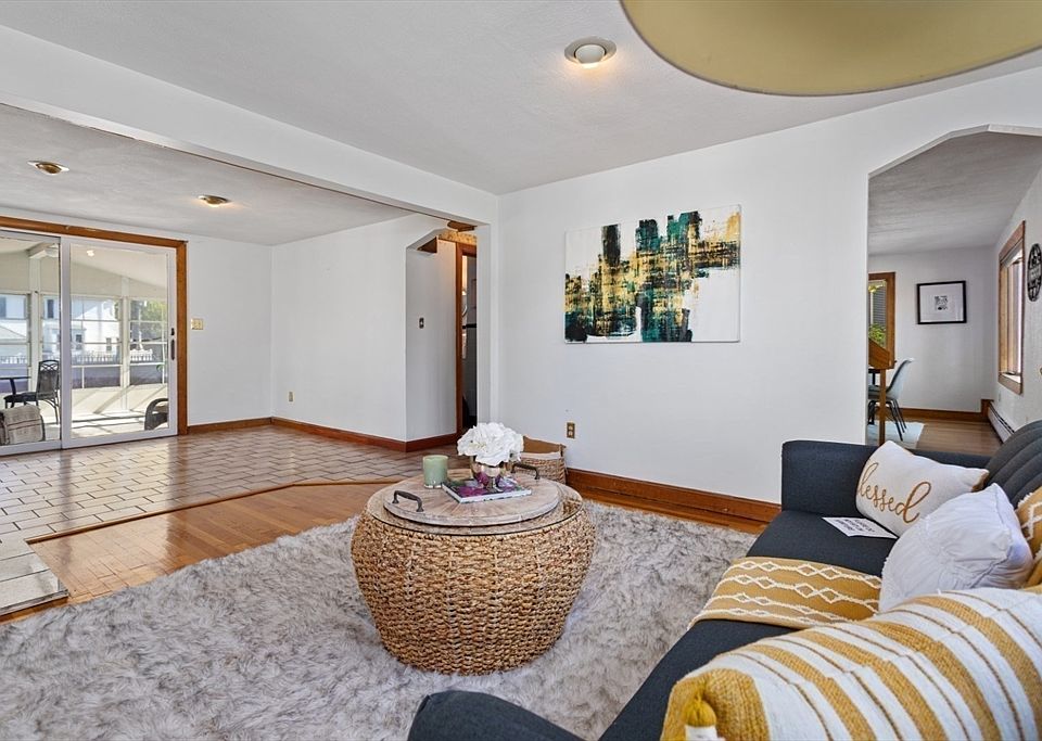 Welcome to this open-concept home, freshly painted throughout, featuring 3 bedrooms, 2 baths, brand-new flooring on the second level, and new bathroom cabinets. The property boasts two spacious living rooms and a cozy fireplace, leading to a four-season room and an open deck that connects to an above-ground pool. There is also a front deck off the kitchen, perfect for enjoying your mornings. The large, inviting kitchen, now with brand-new countertops, includes a central island, making it a great space for cooking and entertaining. First Open House Sat and Sun from 1:00-3:00 PM.