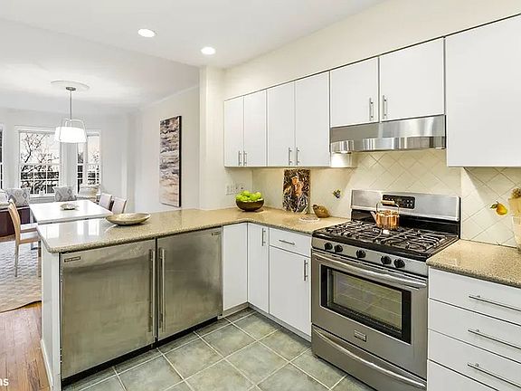 The entertaining level boasts a large and super charming square living room with wood-burning fireplace and exposed brick as well as a bright, oversized South facing terrace. A generously proportioned kitchen is open to the dining room, with unique bay windows overlooking the tree-lined street. Also on this main level is a bedroom with full bath. The full bath also functions as a powder room and this bedroom could be opened to the dining room to create an expansive loft like entertaining area.