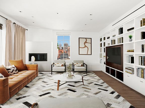 Stretch out in the living area surrounded by built-in cabinetry, a linear gas fireplace and unimpeded vistas that stretch all the way to the Empire State Building. Plan your next dinner party at the custom dining table, and enjoy a beautiful open gourmet kitchen filled with wood cabinetry, solid countertops and stainless steel appliances. An adjacent wine room with built-in refrigeration makes entertaining easy, or convert the space to the ideal office nook. Down the hallway, you'll find another large skylit living space ideal for a family room, playroom or media lounge.