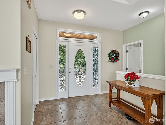 Experience luxury coastal living at its finest in this elegant daylight rambler with stunning views of Port Susan and the Cascades. This open-concept home features soaring ceilings, a wall of windows, and a cozy gas fireplace. The gourmet kitchen boasts cherry wood cabinetry, quartz counters, a walk-in pantry, and a garden window. Enjoy al fresco dining or morning coffee on the expansive view deck off the dining area. Main floor office plus a spacious lower-level bonus room. Set on a generous lot with rolling lawn, fruit trees, greenhouse, and ample parking. Direct access to the community trailhead plus private beach access. Upgrades include new water purification system, appliances, heat pump, roof, and more.