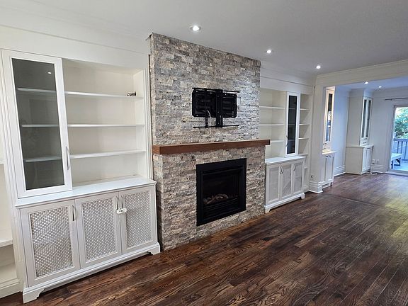 Open-concept main floorHardwood floorsCustom built-insCozy fireplaceModern kitchenStainless steel appliancesStone counters