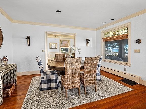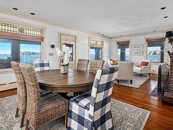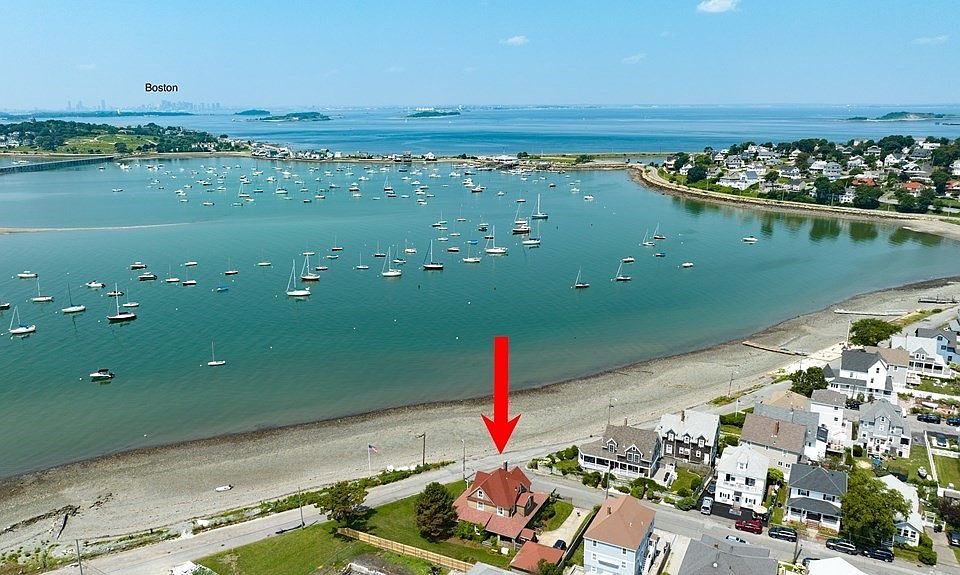 Panoramic views of the Bay and Harbor from this direct waterfront colonial on coveted Cadish Ave. This ICONIC home is noted for its oversized lot and nostalgic, wrap around porch (with over 1000 SF) to entertain a large group or sit comfortably enjoying the ocean breeze, spectacular views and mesmerizing SUNSETS. Classic turn of the century colonial w/high ceilings, large windows, wood floors and period details throughout. The first floor offers a spacious eat in kitchen w/Butlers pantry, gracious dining room w/fireplace, living room and cozy family room. The original house offered 4 Bedrooms upstairs, but current owner took down a wall to create a larger primary suite. Expansion opportunity in the WALK UP attic that offers soaring ceilings and dormers for great natural light. Enjoy the expansive beach in your front yard, or launch your dinghy to your mooring. Rare 2 car detached garage and plenty of room to expand. Fabulous OPPORTUNITY to make this classic home your own!