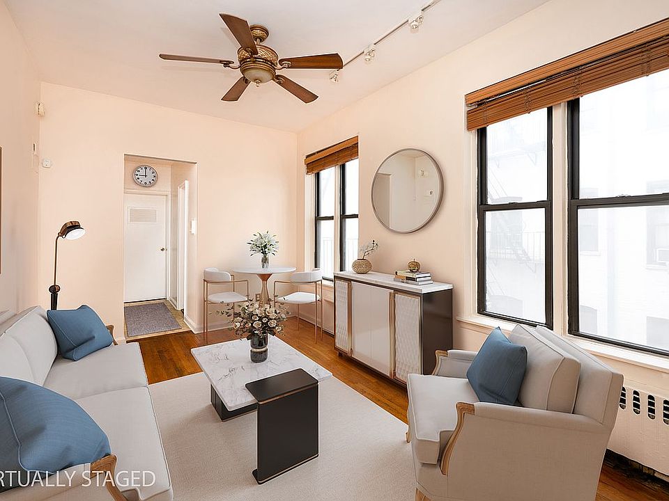 Great opportunity to own a charming and affordable one-bedroom apartment adjacent to Columbia University. This bright, secluded home features high ceilings, hardwood floors, tall windows and a delightfully retro bathroom. The oversized bedroom accommodates any size bed, a study area and dressers with ease, plus three large closets. An efficiency kitchen does the job, while a through wall A/C sleeve and large storage closet complete the space - all just waiting for your personal touch!