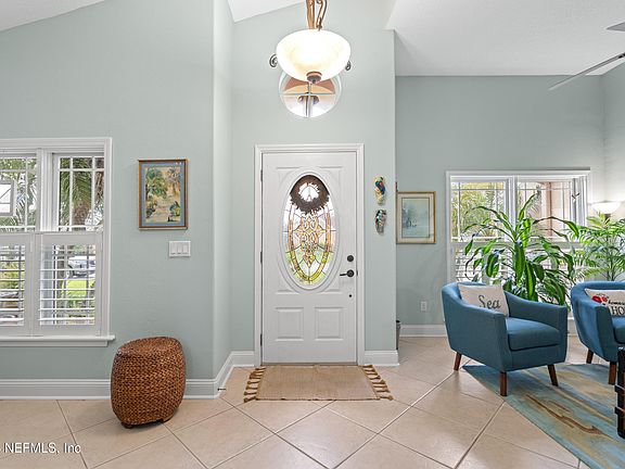 Impeccably maintained one story waterfront home in Ponte Vedra Beach with NEW pool and outdoor area. Freshly painted interior and exterior. Natural light abounds throughout the open floor plan with 12 ft ceilings. 4 bedrooms/2 baths with an oversized master bedroom which includes a sitting area and renovated bathroom with Japanese soaking tub. 4th bedroom has a built-in desk and murphy bed, perfect for guests. Kitchen boasts oversized breakfast bar, newer cabinets, gas stove, and coffee bar with beverage refrigerator. Tile and wood floors throughout. Gas fireplace and hot water heater. The stunning paver pool area with screen enclosure overlooking the lake to preserve was completed in 2024. Pool has an energy efficient pump with ozonation. Yard has beautifully updated landscaping and irrigation in the front and back. Newer items include garage door opener, vents cleaned, HVAC 2022, Roof 2015, and a new washer and dryer. Seaside offers beach access, pool, tennis & RV/boat storage.