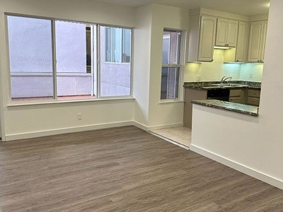Spacious 1 bedroom apartment with updated kitchen and bathroom. Nice open layout with renovated kitchen featuring granite countertops and stainless steel appliances including dishwasher, and breakfast bar. Luxury vinyl flooring throughout. Bedroom has little nook that can be used as an office area. Large patio accessed from both the living room and bedroom.