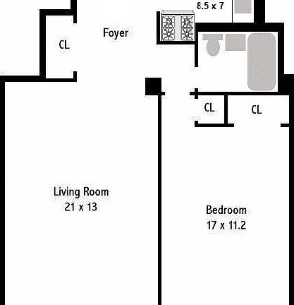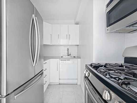 A welcoming entry foyer has two large closets and leads to the generously sized living room with enough room for an additional dining area and a workspace. The renovated kitchen has ample storage and counter space, a full size gas range, French door refrigerator and dishwasher. King-sized bedroom has a corner exposure and 2 closets. Marble bathroom with updated vanity and recessed mirrored medicine cabinet. Central heat and a/c, hardwood floors.