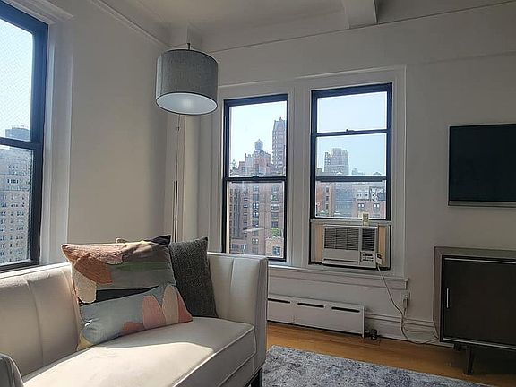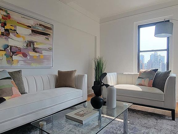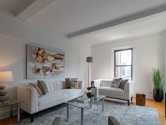 Apartment 12E is entered through a gracious foyer that leads to a well-proportioned living room. There are two large bedrooms, both with excellent closet space, and they share an adjoining full bathroom. A second half bathroom is located off the kitchen. There is room for a dining area in the spacious kitchen which has a separate service entrance.