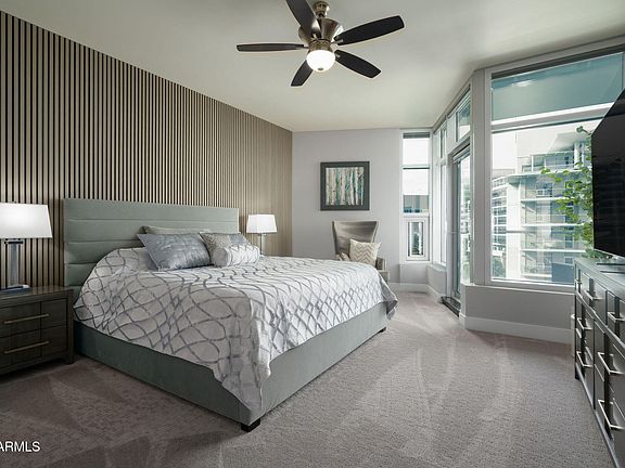 Luxury living at Bridgeview at Tempe Town Lake, an iconic glass-and-steel tower with triple-pane windows. A real lock and leave - nothing to upgrade! Views of the Pool and Camelback Mountain. This updated 2-bed, 2-bath split plan offers privacy with the primary and guest suites on opposite sides of a grand open great room. Over $74,500 in recent improvements include: new AC Unit, new carpeting, new built-in Jennair refrigerator & dishwasher, custom ribbed wood paneling in Great Rm and Primary Bedroom, motorized blinds, and fresh paint. Bridgeview connects directly to Tempe Town Lake's miles of smooth waterfront paths for walking, jogging, biking, and sunset strolls. Enjoy 24/7 desk service, fitness center, pool/spa with pizza oven, theater, club room, lounges, and more. You may see all the upgrades under the Document Tab. The desirable split floor plan lives like two private suites with generous separation between the primary and guest rooms, centered around a grand open great room with Amazing Views