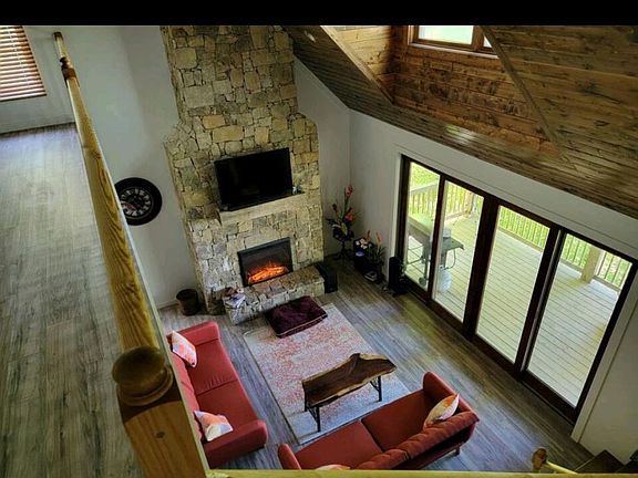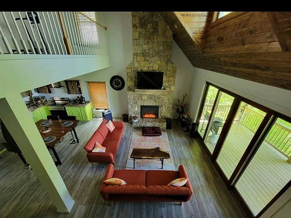 This luxury cabin with a breathtaking view of the mountains has tons of space with very high ceilings and natural light. It is located alongside a waterfall and trailhead (there are miles of private hiking trails in the Mountain Air Community with 1,400 feet elevation change). One of the 6 beautiful parks on the mountain with picnic and a pond is just across the street. The house includes 2 balcony decks, 2 living rooms, an office/ guest bedroom, 2 full bedrooms and 2.5 bathrooms. Fully furnished as a previous vacation home with everything you could need to move in right away. Gas grill, brand new stainless steel appliances, 2 flat large screen TVs (65 and 70 inch), new comfy tempurpedic platform beds (1 king, 1 queen, 1 twin), hardwood floors, washer and dryer, brand new vanities, clawfoot tub in master. Owner provides free high speed wifi, trash, all hoa fees paid by owner. Renter responsible for electricity and water.