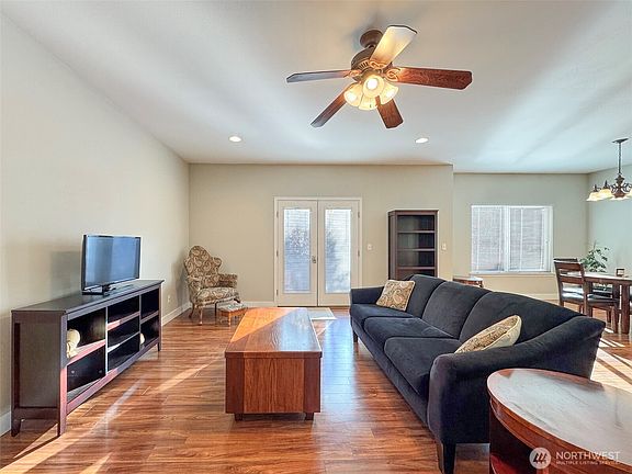 Welcome home to Sun Meadows. This 2 bedroom, 2 bath home is move in ready & has been very well maintained. Enter through the covered front porch, which overlooks the green space, and you are welcomed with an expansive great room featuring high ceilings, an open kitchen/dining area w/ center island, & a large living room. The French doors open to a private, exterior patio & terraced garden w/ two abundant fruit producing trees, an Asian Pear & a Spartan Apple. This low maintenance yard is perfect for just enjoying Sequim, instead of yard work, & the homes location directly across form the green space is ideal. Sun Meadows is perfectly located to all that Sequim has to offer, the Olympic Discovery Trail, Carrie Blake Park & all the shopping.