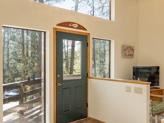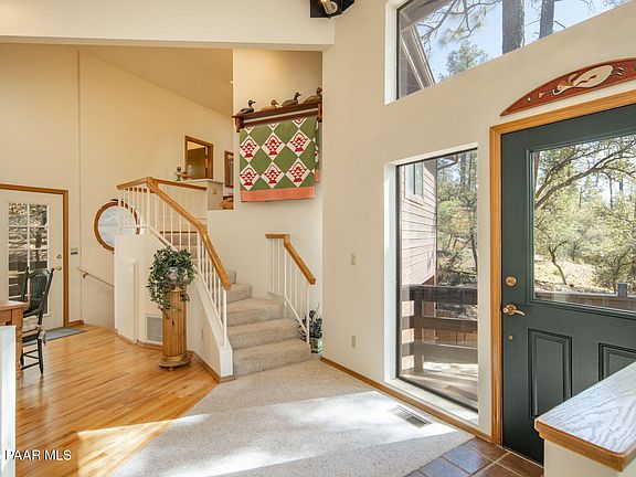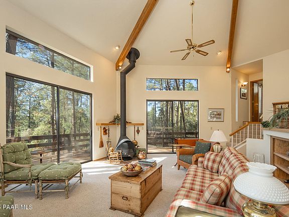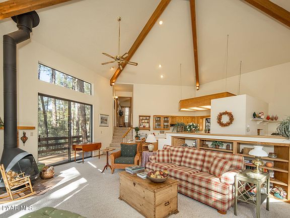 Discover a truly unique and serene living experience with this rare opportunity to own a meticulously maintained, modern cabin-style home nestled on 2 EXPANSIVE ACRES within the highly sought-after Hidden Valley Ranch community. This exceptional offering includes not one, but two distinct parcels of land: the primary lot where the home resides, and an adjacent 1.21-acre county parcel. This additional acreage serves as a valuable buffer, ensuring unparalleled privacy and preserving the breathtaking natural vistas behind your home.Situated in a charming and tranquil cul-de-sac, this property offers the perfect blend of secluded country living with convenient access to the vibrant heart of downtown Prescott, just a short drive away. Imagine waking up to the soothing whispers of the wind through the pine trees, with panoramic views gracing the large expanse of windows that define this stunning residence.This distinctive ''Hexagon'' style home is an architectural marvel, boasting an impressive 22-foot cathedral ceiling in the great room, crowned by a custom-designed Cupola that floods the space with natural light. The great room itself is a testament to innovative design, featuring a captivating cantilevered structure supported by four exposed major beams, creating an open and airy atmosphere that is both grand and inviting.The heart of the home, the kitchen and dining areas, exude warmth with their beautiful oak hardwood floors. The kitchen is a chef's delight, offering abundant countertop space, ample custom cabinetry, a convenient breakfast bar, and a charming garden window perfect for nurturing herbs or showcasing decorative plants. The adjacent dining room is equally functional and elegant, featuring built-in cabinetry and a handsome oak top. For those chilly Prescott evenings, a powerful wood-burning fireplace in the great room efficiently heats the entire home, creating a cozy and inviting ambiance.Privacy and comfort extend to the living quarters. The oversized Master Suite is a true sanctuary, offering serene views, a luxurious private bathroom with a separate tub and shower, and a spacious walk-in closet. On the opposite side of the home, two additional well-appointed bedrooms share a common bathroom, and a stackable washer and dryer are conveniently located, ensuring maximum functionality and ease.Beyond the boundaries of this exceptional property, Hidden Valley Ranch provides an array of desirable amenities. The subdivision sits gracefully adjacent to the vast expanse of the Prescott National Forest, offering endless opportunities for outdoor adventures, from hiking and biking to wildlife observation. Residents also enjoy access to a community pool, tennis and racquetball courts, and a well-equipped fitness center, fostering an active and engaging lifestyle.FURNITURE to convey outside of escrow with separate bill of sale which will allow you to move in and immediately begin enjoying the Prescott lifestyle. The owners have meticulously cared for and maintained this property throughout the years, evident in numerous recent upgrades. The exterior of the home was freshly painted in June 2024, enhancing its curb appeal. A new gas hot water heater with a re-circulating pump was installed in April 2025, ensuring efficient hot water on demand. The oversized two-car garage is heated and equipped with a 220v plug, providing both comfort and utility. Energy efficiency has been a priority, with the entire crawl space ceiling thoughtfully insulated. Furthermore, a newer ''ThermaTru'' fiberglass front entry door with a decorative window has been installed, adding both style and security to this exceptional residence.