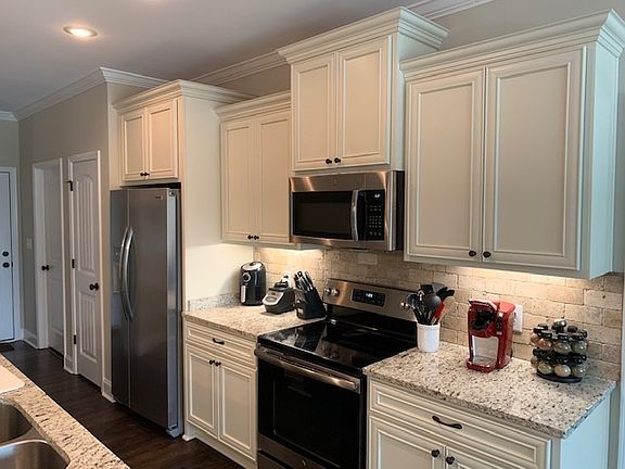 ALL BRICK open/split plan with 4/2 and offers granite counter tops throughout, stainless steel appliances, pantry, island, under cabinet lighting, coat closet, smooth ceiling, designer colors, front gutters & separate laundry. Hardwood in foyer, living room, kitchen, breakfast area & hallway and all bedrooms. Tile in laundry/bathrooms and carpet in bedrooms. Master bedroom has trey ceiling with recess lights. Master bath offers tile shower, double vanity, separate water closet, linen closet & garden tub!