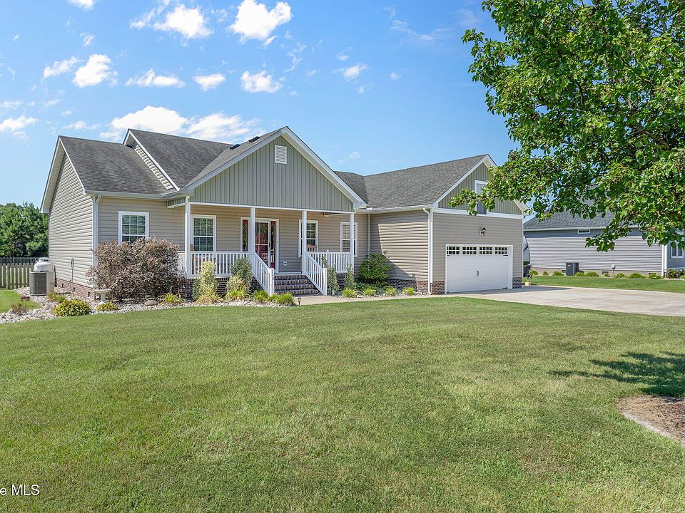 Welcome to this beautifully maintained home! This spacious 3 bedrooms, 3 bathroom split floor plan home features an inviting foyer with an office, opening to the living room with vaulted ceilings and a cozy fireplace. The kitchen has granite counters, stainless steel appliances to include a gas stove, a dining space, and a bar area with extra seating. The primary suite has lots of light and tall ceilings with attached bathroom to include dual sinks, a soaker tub, separate shower and walk in closet. Experience the ease of single level living with the added bonus of a FROG with a full bathroom that is perfect for a guest suite, playroom, or media room. You will love the oversized laundry room, and the spacious garage with a utility sink. Outside you can enjoy time on the patio and a bonus of 2 sheds for plenty of storage. The Shingle Landing neighborhood offers sidewalks throughout, a park, and boat ramp. Come see it today!
