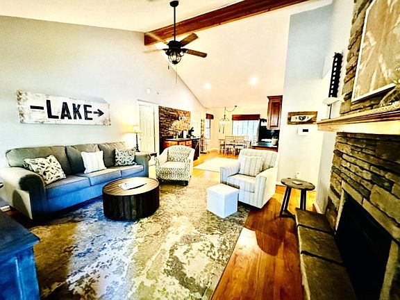 Nestled among the trees on a large corner lot. Charming 3 Br, 2 Bath with open floor plan. Living area has faux stone propane gas fireplace, vaulted ceiling, kitchen and dining areas opens onto a screen porch. Gathering with family and friends around the "outdoor" Stone Fireplace will become one of your favorite spots. Plenty of parking with a "front and back" circle driveway. Room for a Garage/Shop and an Invisible fence. Selling mostly furnished. Neighborhood access to the lake.