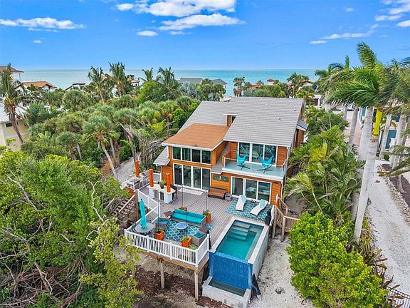 LIVE THE ULTIMATE COASTAL LIFESTYLE on the coveted Casey Key barrier island at this vibrant 3-bed, 3.5-bath waterfront retreat, perfectly positioned along the Intracoastal Waterway with dazzling, front-row views. Designed for unforgettable days on the water, this home features a stunning Aqua-Tech infinity edge heated pool with therapy jet ledge, where you can unwind while watching boats, jet skis, kayaks, and the occasional dolphin glide by. Set on a generous .49-acre lot with lush tropical landscaping, fresh exterior lighting, brand-new shell driveway, and beautifully re-stained cedar siding (2025), the home blends island charm with modern updates. A shared, deeded boat slip offers quick access to the Intracoastal—perfect for sunset cruises, fishing trips, or lunch runs to nearby waterfront restaurants. Step inside to soaring ceilings and sun-filled living spaces anchored by gorgeous engineered hardwood floors. The open-concept great room flows effortlessly to an expansive composite deck designed for entertaining, complete with multiple lounge zones, a grilling area, and panoramic water views that make every gathering feel like a vacation. The chef's kitchen shines with sleek cabinetry, premium stainless appliances, a dramatic stone island, and a glass tile backsplash. A stylish dry bar with leaded glass barn door adds an extra touch of coastal chic. All three bedrooms with their own private ensuites, while the loft provides flexible space for an office, den, or artist’s perch overlooking the main living area. The metal tile roof provides long-term durability, and the optional HOA (only $400) adds neighborhood security without CDD fees. Enjoy peaceful island living with the convenience of Blue Lagoon Restaurant, Mariner Jack Marina, boat and jet ski rentals, fishing spots, and Sarasota’s vibrant dining and cultural venues just minutes away. Private aviation is close by, making travel effortless. Experience waterfront living at its most energizing and serene on one of Florida’s most treasured islands. This is Casey Key—where every day feels like a getaway.