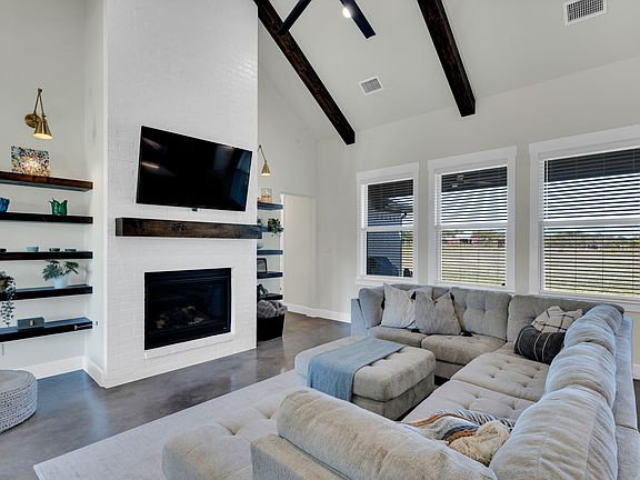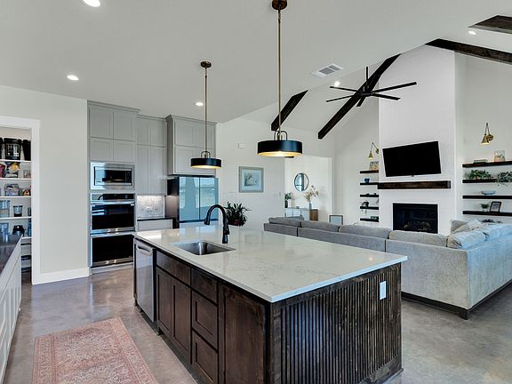 Warm natural lightFloating shelvesFour bedroomsTwo bathsEpoxy flooringThree car garageGorgeous quartz countertops