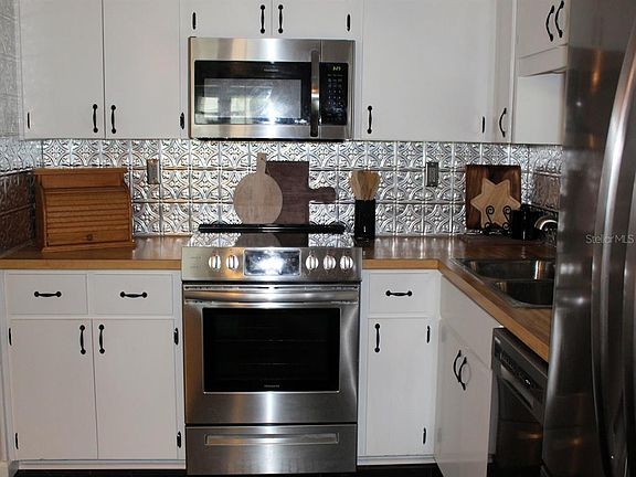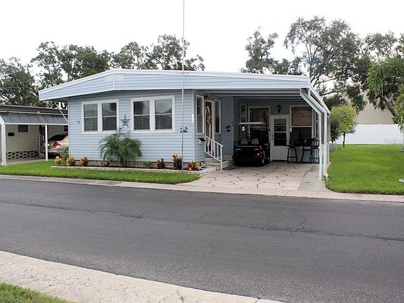 A well-maintained, updated double-wide mobile home featuring two bedrooms and two bathrooms is now available in the pet-friendly section of Palm Hill Mobile Home Park. There’s even a patio in the backyard with lush green space beyond and no rear neighbors. Palm Hill’s one monthly fee of $554 covers a lot- water, sewer, trash, recycle pickup, lawn care, cable, and internet. The community has endless opportunities for enjoyable living. Pools, Jacuzzis, tennis, pickleball, golf, shuffleboard, and social events at the two clubhouses provide comfortable ways to make new friends. With 1284 heated square feet this delightful home is designed for easy living. The floorplan flows naturally with the dining and living area circling around the kitchen. The kitchen features modern updates, including striking tile floors and stainless appliances (range, overhead microwave, dishwasher, and refrigerator.) White cabinetry has been freshly painted and is complemented by new hardware. The silver backsplash is striking. There is abundant storage space in the kitchen. A butcher block peninsula provides a natural transition between the kitchen and dining room. Walls and trim in the living area are freshly painted with a relaxing color. Plantation shutters in the living and dining room add a finishing touch. The living room opens to the front Florida room with an outside entrance. At the opposite end are the two bedrooms. The primary has plenty of storage space with a walk-in and two smaller closets. The ensuite bath is completely redone with vanity, floor, walls, mirror, light fixture, shower, and exhaust fan with heat. The hall and hall bath feature new tile floors and a tub with a shower. The bath also opens into the guest bedroom. This is ideal for guests as it creates a private suite. Another interesting feature of the home is the bonus room adjacent to the carport. Stairs go up to the inside living area. The owner uses this space for a fun tiki room. The washer and dryer are conveniently situated at the back of this room, making laundry chores easy. The property includes a roof over installed in 2022 covering both the mobile home and the bonus room. The light gray siding with white trim, and an extension off the one car carport presents an attractive outside picture. A door from the bonus room leads outside to a relaxing patio area surrounded by the lush greenery of a generous size backyard. There is an additional storage shed attached at the back of the home. A share of $35,000 is included in the price of this move in ready home. The owner plans to sell it partially furnished. To see please call for a quick appointment.