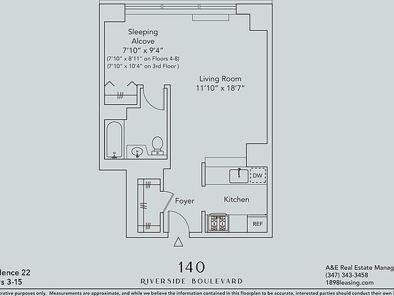*This gut renovated ALCOVE studio is perfect for people who are seeking an alcove that comfortably fits a queen size bed and that offers that separation that so many people are looking for. This unit is located in the heart of Lincoln Square in the iconic building at 140 Riverside Blvd.*