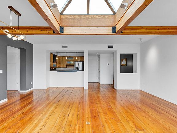 Spanning 1,472 sq. ft., the home showcases beautiful, reclaimed wood floors and is filled with natural light from floor-to-ceiling windows and a striking skylight. The open-concept kitchen and living area are ideal for entertaining, featuring stainless steel appliances, a gas range, and sleek concrete countertops. Just off the main living space, you'll find a stylish powder room for guests and a tucked-away laundry area for added convenience.
