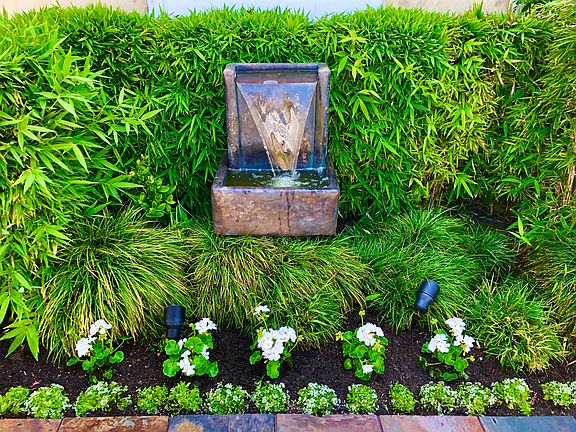 Waterfall faucetTranquil waterfall featureRestoration hardware furnishingsGourmet kitchenContemporary vanitySpa-like en-suite bathroomPrivate deck