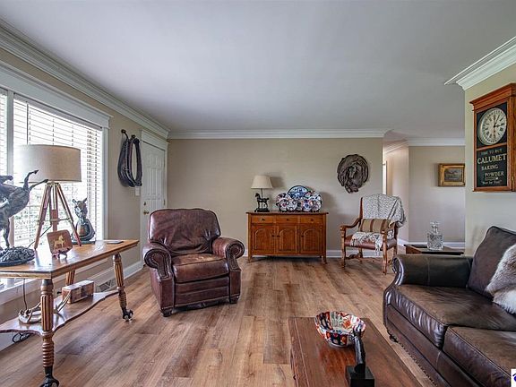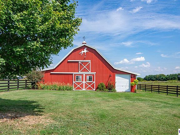 What everyone wants...a lovely home sitting on almost 5 acres, with horse facilities, less than 15 minutes from town, right? This property checks all those boxes and more! This beautiful, meticulously designed brick home will greet you at the front porch with custom railing by local wrought ironworks artisan John Mills, of John Mills Ornamental Iron Works. It was fashioned in the scrolled baluster design. It emulates qualities in common with New Orleans supportive filigree style railings and panel. As you enter the home, you will find architectural detail, and a polished finish in the living room, dining room and through the home with custom designed, crisp, white crown molding. The kitchen boasts custom cabinetry by local cabinetry designer Walters Cabinets. It also features elegant granite countertops! This home has a 13'X23' primary suite, mostly finished basement, fireplace, scenic screened porch, breathtaking landscaping and 2 car garage w/automatic openers. This property also features a picturesque red metal barn with 4 horse stalls...one being a foaling stall. Each stall has rubber matting for equine comfort. The barn has a COVERED RIDING RING, tack room, Run-In shed, chicken coop and equipment storage area. The riding ring was specifically designed with large, medium and fine grade rock with a compressed clay surface. This one of a kind property has black rail horse fencing, high tensile fencing and automatic watering system. Some may call it a Hobby Farm, you better call it yours, Quickly!