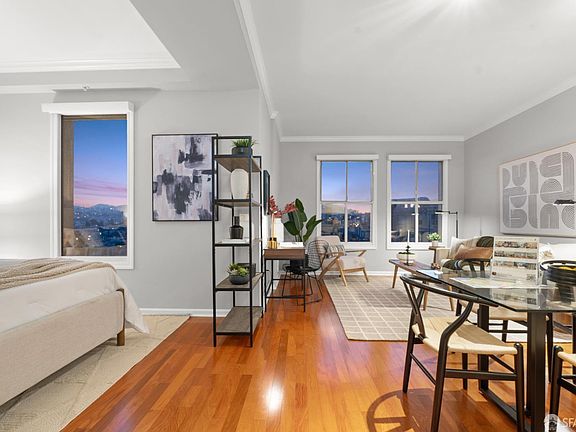 This move-in ready junior one-bedroom, one-bathroom penthouse offers modern comfort and a prime central location. The open-concept layout features hardwood floors, roller shades, and a spacious sleeping area that fits a queen or king bed, complemented by a custom walk-in closet separate from the living area. The upgraded kitchen includes sleek touchscreen appliances with a new stove and cooktop. Additional highlights include a large storage space and optional leased parking within the building for $250-$300 per month. Residents enjoy premium amenities such as a fitness center, exercise studio, conference room, landscaped courtyard with a fountain, and business meeting room. Perfectly situated in the heart of the city, this home offers unmatched walkabilityjust steps to Hayes Valley, Mission Dolores, SoMa, and Nob Hillputting the best of San Francisco's dining, shopping, and entertainment all within easy reach, along with tech shuttle stops right out front for effortless commuting.