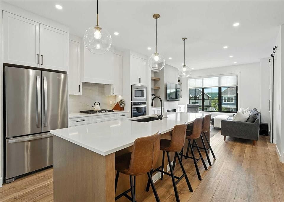 Step into modern elegance with this newly built corner-unit townhouse, perfectly situated in Griffith Pointe at Discovery Ridge. Perfectly positioned just steps from Griffith Woods, you’ll enjoy sweeping valley views and endless kilometres of walking and biking trails. Within a quick 5–10 minute drive, you’ll find quality schools, Westhills shopping, groceries, restaurants, and LRT access. Designed for modern living, this home offers 3 bedrooms and 3 bathrooms with just over 1,700 sqft across a smart, stylish layout. The oversized double attached garage easily accommodates a large SUV and a second vehicle, while the entry level provides a bright, versatile flex space—perfect for a gym, second office, or multipurpose room. The main floor showcases a chef-inspired kitchen with built-in appliances, designer tile backsplash, and a spacious island with breakfast bar. The kitchen flows seamlessly into the living room, anchored by a cozy gas fireplace with custom built-ins, and a dining area enhanced by a custom buffet offering both beauty and storage. A private, door-closing office creates the ideal work-from-home retreat. Expansive sliding doors lead to a large west-facing balcony, where you can enjoy spectacular sunsets and host family and friends. A powder room and cleverly designed storage complete this level. Upstairs, the primary suite feels like a private sanctuary with soaring vaulted ceilings, oversized windows overlooking the ravine, a walk-in closet, and a spa-like 5-piece ensuite featuring dual vanities and a soaker tub. With 2 additional bedrooms a full bathroom, plus an upstairs laundry room, add daily convenience. Over $30,000 in thoughtful upgrades make this home truly stand out: custom living room built-ins, a dining buffet, additional kitchen drawers, a dedicated office with sliding barn door and built-in desk, mirrored gym wall, and professional custom blackout window treatments. Impeccably maintained and beautifully finished, this turn-key property offers an elevated lifestyle of comfort, functionality, and style in one of Calgary’s most sought-after communities.