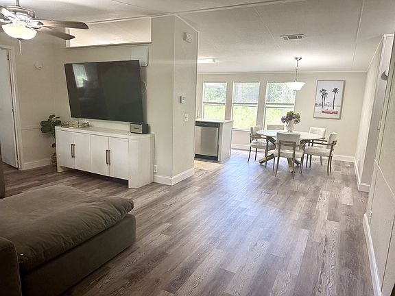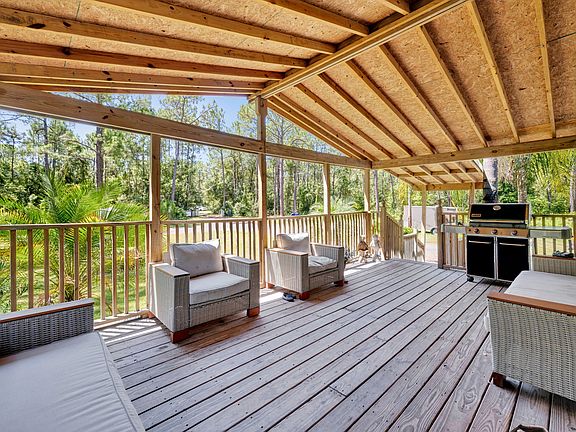 Welcome to LUXURY COUNTRY LIVING sitting on ONE full acre LEVELED & CLEAR LOT with NO HOA on a DEAD-END STREET. This FULLY RENOVATED HOME BOASTS a METAL ROOF, NEW HVAC/air-ducts, and an OVERSIZED DRIVEWAY for parking, offering the perfect blend of COMFORT & SERENITY. Enjoy relaxing in either an OPEN/EXTRA LARGE COUNTRY-STYLE FRONT PORCH or in a SCREENED-IN REAR PORCH. The interior offers: ALL WHITE INTERIOR WALLS, LIGHT GREY FLOORS, starting with a SPACIOUS LIVING ROOM, and LUXURY VINYL PLANK FLOORING all throughout the SPLIT-PLAN layout with 3 bedrooms and 2 bathrooms. The Master bedroom contains his-and-her closets, one of which is a WALK-IN closet. The second bedroom also offers a walk-in closet. The Master bathroom is spacious, featuring double sinks, a tub, and a separate shower. The BEAUTIFUL KITCHEN features ALL-WHITE CABINETS, QUARTZ COUNTERTOPS, and STAINLESS STEEL APPLIANCES. The LG WASHER & DRYER are located in a separate LAUNDRY ROOM off the kitchen. You'll appreciate the NEW WHOLE HOUSE WATER FILTRATION SYSTEM, complete with a Reverse Osmosis filter under the sink for FRESHWATER DRINKING, as well as a NEW SEPTIC system. Enjoy the benefits of your own PRIVATE ROADWAY and plenty of space for PARKING LARGE RV or TRUCKS. MATURE TROPICAL WOODLANDS embellished with beautiful Palm Trees SURROUND the property for MAXIMUM PRIVACY. The large garden comes with TWO EXTERIOR STORAGE SHEDS. Whether you have livestock, commercial vehicles, or are simply looking to enjoy the peace offered by nature, this rental property offers a unique, haven hard to find. This secluded retreat of a home is conveniently located at the corner of RT-17 and Ernie Caldwell Blvd, and you're JUST 10 MINUTES DRIVE TO I-4, where you'll find shopping centers, Disney, and the entertainment district.