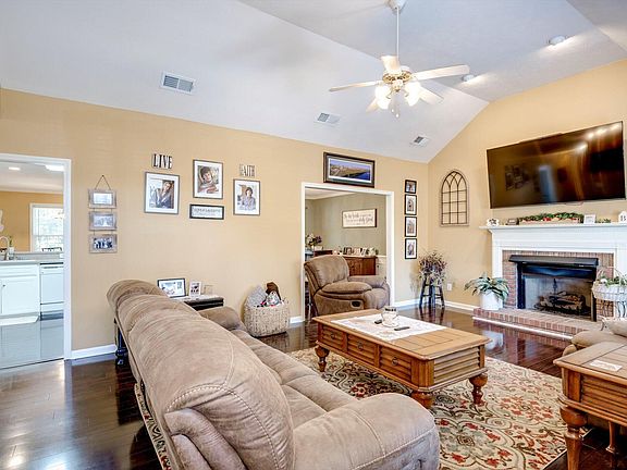 Gas fireplaceLarge patioWell-maintained brick homeLarge kitchenHall pantryVersatile flex spaceBeautiful wood floors