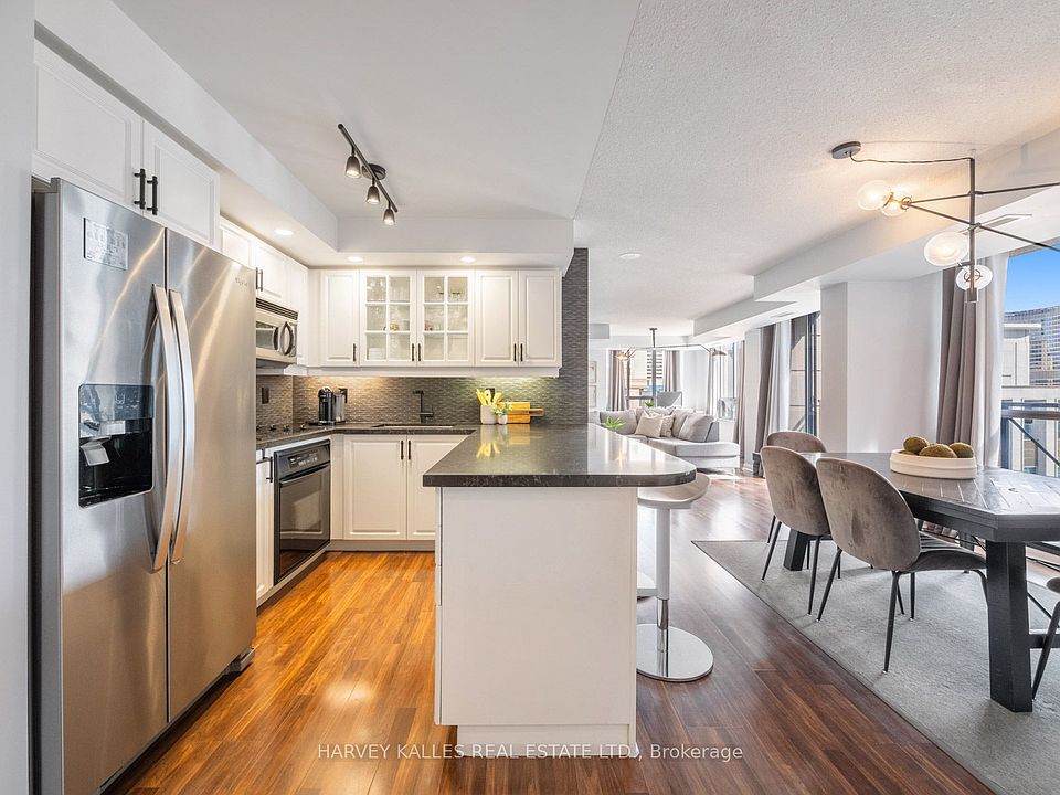 Step into nearly 1,200 sq. ft. of sun-filled living in this rare 2+1 bedroom, 2 bathroom corner suite with North, East, and South-East exposures. Flooded with natural light from multiple directions and framed by two private balconies, this home offers both space and sophistication that are hard to come by in the downtown core. The primary retreat boasts a spacious walk-in closet and a 5-piece spa-inspired ensuite true sanctuary in the city. The second bedroom, equally generous with its large window and closet, connects seamlessly to the family bathroom, making it ideal as a guest room, home office, or both. At the heart of the home, the renovated 2020 kitchen combines style and function with stainless steel appliances, a full-sized island with seating for four, and modern lighting throughout. The thoughtful front entryway features double closets, a laundry area, and extra storage are conveniences in condo living. Freshly painted and move-in ready, this suite includes parking and a locker, completing the package. All this in a prime downtown location steps from theatres, restaurants, shopping, and transit. 140 Simcoe offers both the energy of the city and the quiet of a residential enclave.