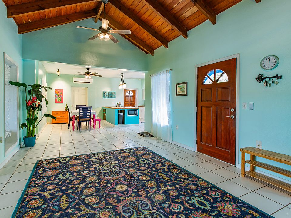 Lovely family home centralled located mid-island. Spacious living in 4 bedrooms and 2 baths. Master bedroom has access to the back covered porch for those stargazing nights. Master bath is stunning with a gorgeous walk-in shower and his and her vanities. Views of the water along with 2 sugar mills and the rolling hillside make this an extra special home. Large 1/2 acre lot with plenty of room for play areas, gardening or even a pool. Solar, Hurricane rated windows, and a UV water filtration system make this home very efficient. Paved roads and garbage pickup are a bonus for the neighborhood. Come take a look at this sweet home and you might just picture yourself living there!