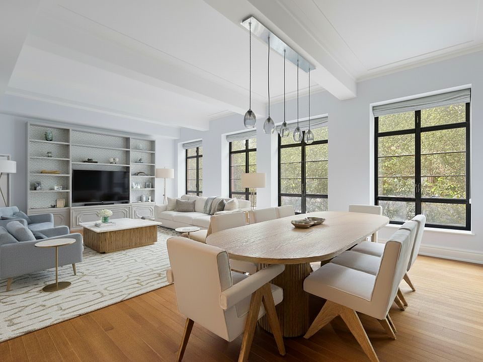 At the heart of the home is a spacious south-facing great room with 10-foot beamed ceilings, large casement windows, and tranquil views over the building's lush, landscaped central garden. Natural light fills the space throughout the day, highlighting the custom built-ins that anchor the dining area and add both elegance and functionality.