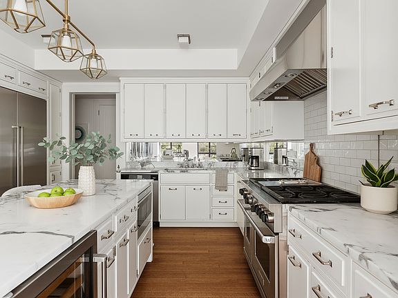 Just off the great room, the chef's kitchen is as beautiful as it is practical, with custom-paneled white cabinetry, white marble countertops, a mirrored backsplash, and top-of-the-line Wolf, Sub-Zero, and Miele appliances. A marble overhang creates a breakfast bar ideal for casual dining or entertaining, complementing the generous dining space adjacent to it.