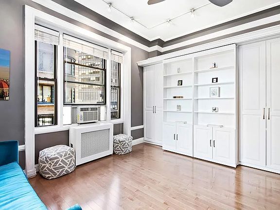 This efficient designer home is a true masterpiece. Built-in shelving slides out to make way for a queen-sized Murphy bed with custom closets on both sides. The high-end kitchen, complete with stainless steel appliances including a Bosch dishwasher, Fisher & Paykel range, and Kitchen Aid dual freezer and refrigerator, also features a breakfast bar, marble countertops, new cabinets and built-in microwave. You even have a custom home office. Pre-war details throughout, including a decorative fireplace. soaring ceilingnd stunning moldings. Additional features include open and Central Park tree-top views, custom blinds, track lighting, and new hardwood floors throughout.