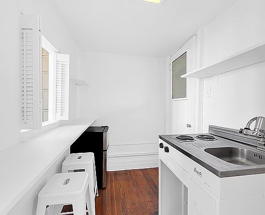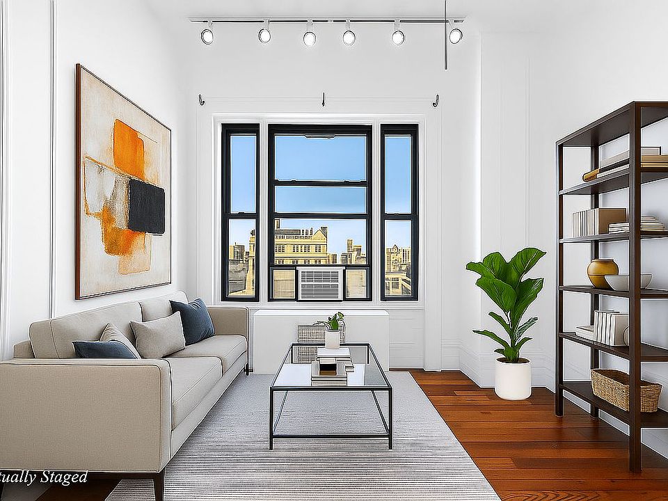 Room with a View! Enjoy 10.5 foot high ceilings and oversized windows from this super sweet studio overlooking the gorgeous city skyline full of architecturally significant buildings that define the Upper West Side. A lofted level above the kitchen and bathroom allow separation of space in this cheerful white box that is primed for your personalization! Thru the prewar archway is a separate kitchen with a pass thru window and shutter doors to connect the kitchen and living room. Picture moldings, and original hardwood floors show off the character and charm of this starter home. The bathroom is updated, clean white, and depersonalized. Kitchen is compact, but separate and can be expanded easily within the footprint, without the need to renovate. Joyfully sunny, all day long with twinkling lights in the evening cityscape view make this apartment feel like the perfect perch point to call home, to treasure for the next chapter of your life.