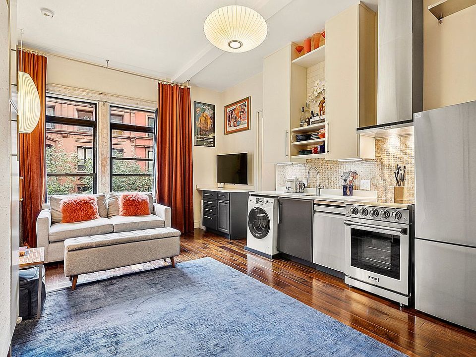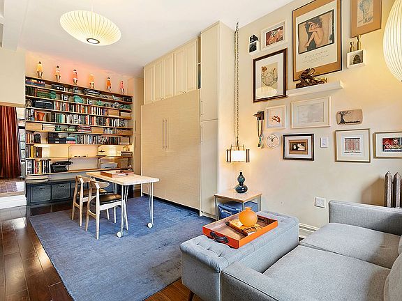 LOW MAINTENANCE LOTTO! NEWLY RENOVATED! MOVE IN READY! This stunning, gut-renovated studio in a historic 1903 flatiron building on West 69th Street offers a rare blend of light, luxury, and smart design. Renovated in 2022 with all-new electrical and plumbing systems, the unit features nearly 11-foot ceilings, custom cabinetry throughout, and a full-height walk-in closet with Elfa drawers for exceptional storage. The windowed bathroom, with 9ft. pocket door is outfitted with a deep-soak tub, Walker-Zanger tile, Caesarstone shelving, and high-end fixtures including a Moen bidet and dual medicine cabinets. Unique touches like a vessel sink atop an antique sewing machine base and a vintage Bakelite mirror add character, while a frosted glass pocket door enhances privacy.