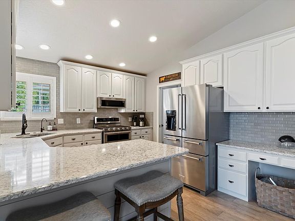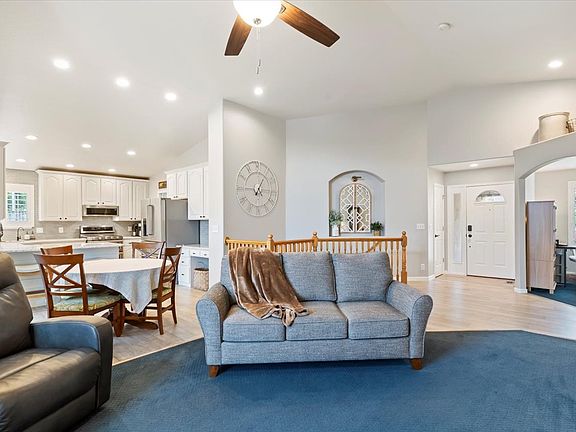 Nestled in a peaceful setting with no backyard neighbors, this updated rambler features main level living, yard care/snow removal included, plus FREE neighborhood RV parking perfect for a low-maintenance lifestyle! Inside you'll find vaulted ceilings, new hickory wood floors, new carpet, new windows and window treatments 2022 (including plantation shutters), fresh paint, and two gas fireplaces. The upgraded kitchen includes updated white cabinets, high-end granite countertops, SS appliances, gas range and gas double oven. Main level primary suite features a walk-in closet, jetted tub and separate walk-in shower. Walk-out daylight basement with large family room, wet bar, and 2 bedrooms (one en suite). Oversized 2 car garage, plus huge cold storage room offer abundant storage space. Relax on the covered Trex deck or patio with mountain views. Your yard care is covered, aside from planting strip behind garden curbing for personal touches. Recent upgrades include new roof (2020), new water heater & softener (2022), new water heater and softener (2022), new appliances, permanent LED lighting, smart thermostat, Ring doorbell, radon system, reverse osmosis, and updated bathrooms with quartz tops.