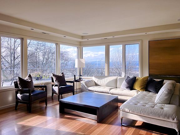 Discover the epitome of serene and private luxury living in this fully furnished, one-level modern home on Queen Anne. Perched on a bluff with breathtaking southwest exposure, this home offers panoramic views of the water, islands, and mountains, creating a tranquil oasis just minutes from urban conveniences.
