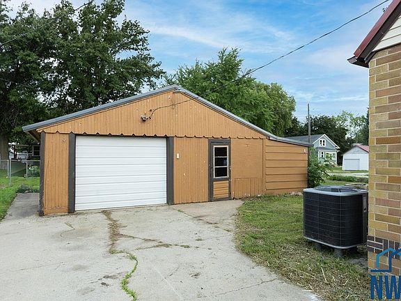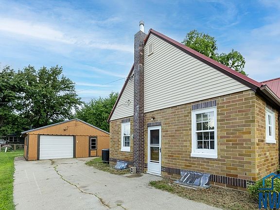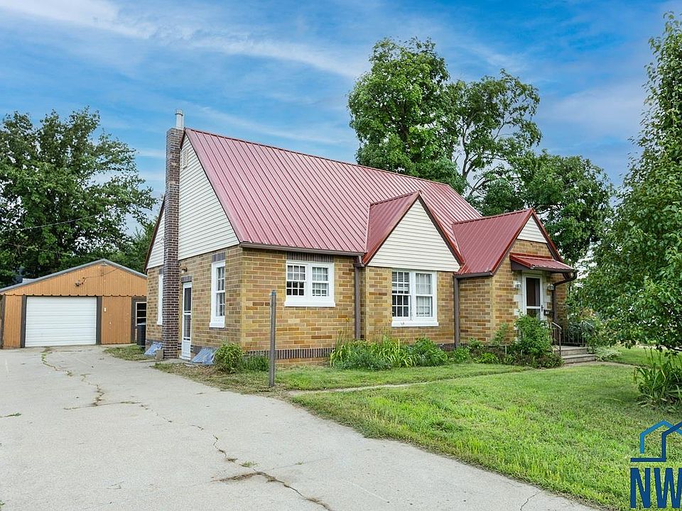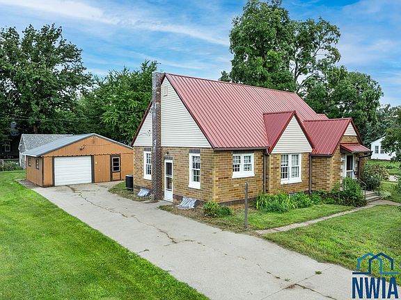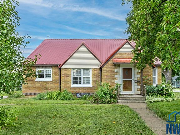 Charming and cozy earth tones brick bungalow. This home sits on a corner lot and has a red metal roof. There are a lot of shrubs and perennials that need a little love and talking to. This could be an amazing yard with some time spent with the plants. The driveway comes from the street and by the side door to unload groceries then put the car away in the garage. The detached garage has two work benches and plenty of space for projects, toys and storage. Entering the original front door into the foyer with two coat closets, then into the living room. The living room, dining room and galley kitchen are open concept living with nice windows to let in the natural light. Off the dining room is a hallway with a linen closet and an original phone nook. The hall leads to the two bedrooms and the full bath with storage shelves and a laundry chute. The back door is through the kitchen and the basement stairway is also here. The basement has the laundry area with a sink and folding cabinet, utilities and storage area with some shelves. There is a small cold room for all your canning, jellies and jams. There are two other divided spaces in the basement.
