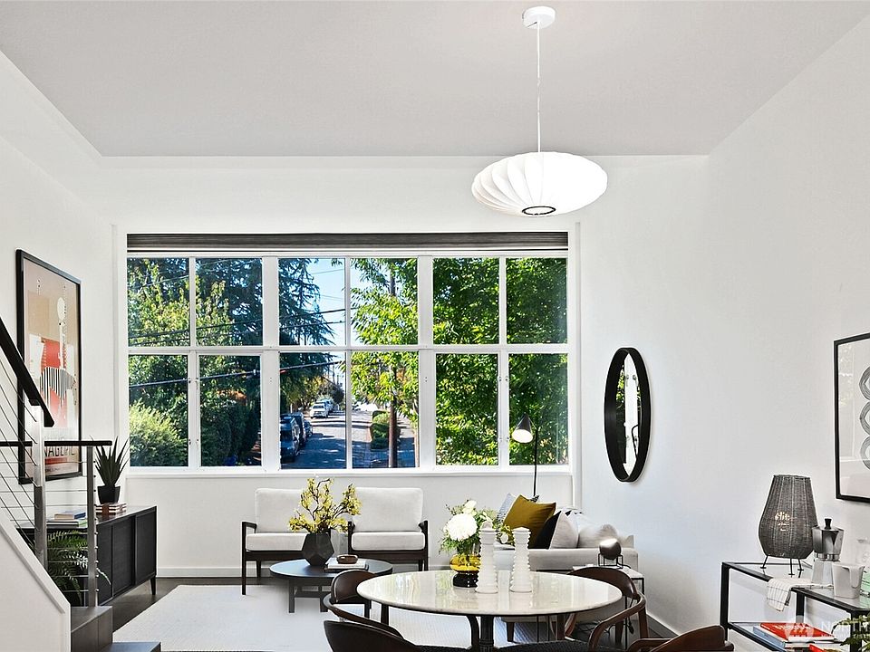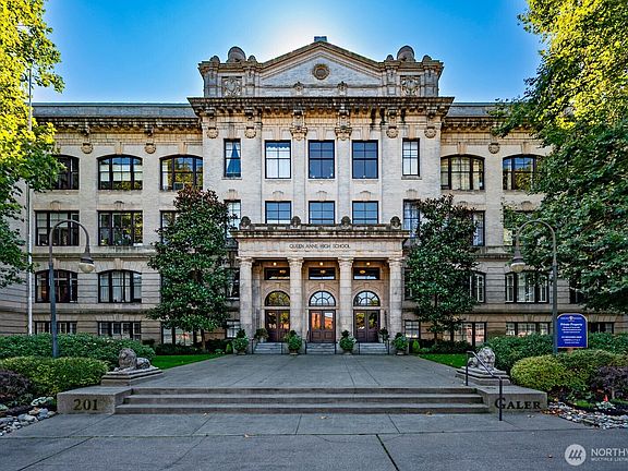 Stunning & light filled top floor townhome style condo perched perfectly w/in the Queen Anne High School Industrial Arts Bldg, a true mid-century modern gem. Breathtaking windows in the lofted main flood the space w/westerly light & leafy green views. Open kitchen, dining, living + 1/2 bath make for an entertainer’s dream. Upstairs: 2 spacious & bright bedrooms, full bath, large closets, full-size laundry & a SPECTACULAR 400 sq ft wraparound deck w/sweeping territorial, mountain & sound VIEWS for yr-round indoor-outdoor living. TWO secure garage spots + storage unit complete this home. Steps to Queen Anne’s shopping, dining & parks w/easy access to SLU. No rental cap & pets OK. Perfect full-time residence or peaceful in-city pied-à-terre.
