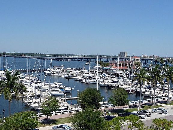 Corner unit with stunning views of the Manatee River and marina below. Brick-lined river walkway provides easy walk to downtown, library next door. Spacious 2 bedroom / 2 bath unit features a recently resurfaced balcony. Elevator in building, open laundry room on each floor. Comes with carport space, extra parking out front.