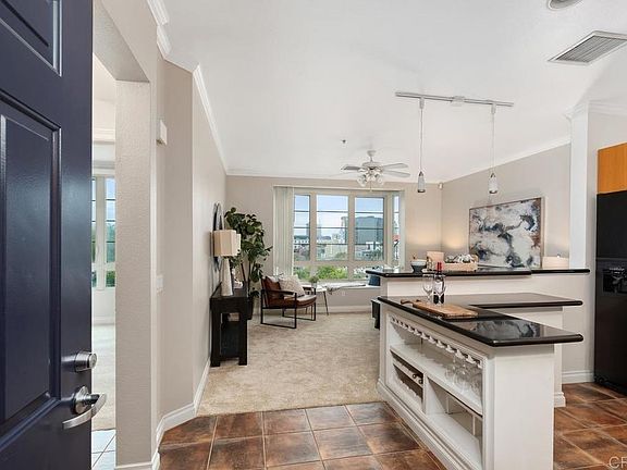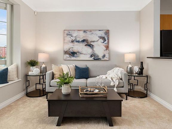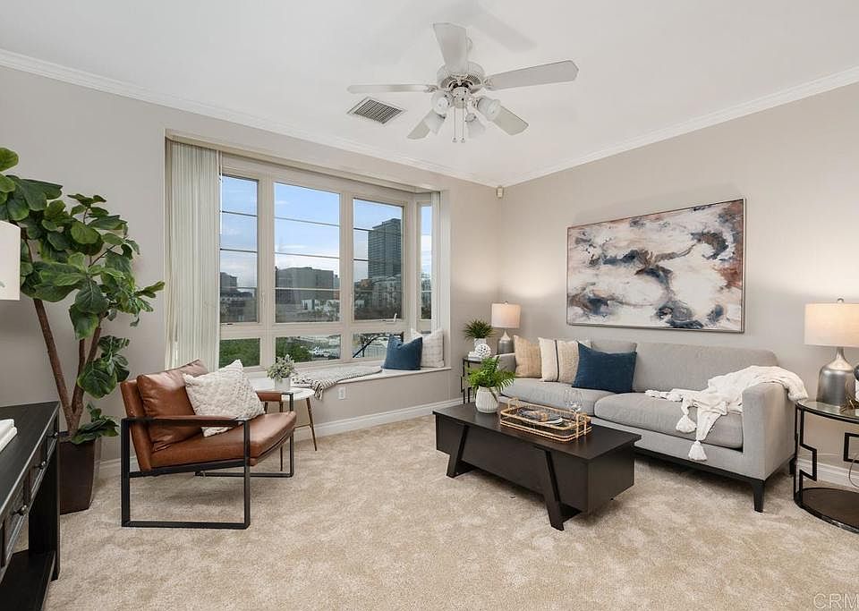 East Village just gets hotter...live the ultimate San Diego DT lifestyle at this Union Square condo. In the most desired building this space features high ceilings and a southern exposure with a view of the Coronado Bridge! Park in your secured garage (24 hr guard), take the elevator up and enter your bright, open space. Enjoy an upscale kitchen with granite counters and breakfast bar open to the living room with a huge bay window framing your city views. Plenty of recessed lighting, custom built-in wine cabinet and bay window seating (w/storage). The kitchen, hall and bathroom have neutral tile flooring. The living room and bedroom have new neutral carpet, fresh paint and crown moulding. The bedroom has a walk-in closet, ceiling fan and built-in high open shelving flank the picture window. The hall closet has a stacked washer and dryer, and all appliances will convey. Live less than a mile from Petco Park, the Central Library, City College, Balboa Park and the Gaslamp Quarters! (Albertsons is .3 mi.) The HOA has well run on site management. See recent newsletter in Doc tab. All MLS information deemed accurate but buyer and agents are to verify all information to their satisfaction before releasing contingencies.