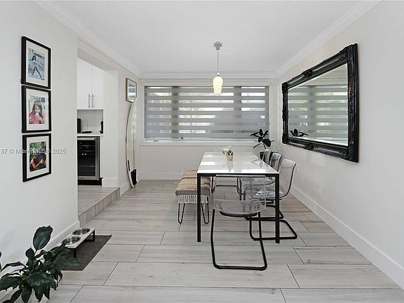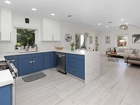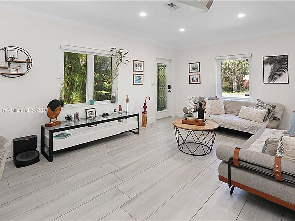 Stunning, high-efficiency 3 bed, 2 bath, 2-car carport home on a corner lot with beautiful lush landscaping! The custom kitchen features waterfall quartz counters, matching backsplash, gas stove, stainless appliances, farmhouse sink, wine cooler, + abundant storage. Enjoy a split floor plan with a formal dining room + sliders opening to a large covered patio ideal for entertaining. Upgrades include impact windows + doors, new gas washer/dryer, metal roof a few yrs old, gas tankless water heater, + a solar panel system! Both bathrooms are beautifully updated, + every room showcases custom closets, crown molding, + designer window treatments. Outside entails a private, large backyard with mango + banana trees, + climate-controlled shed with power that is currently used as an office!