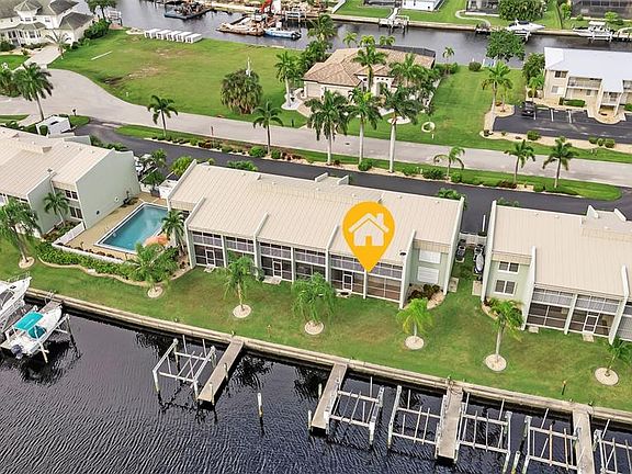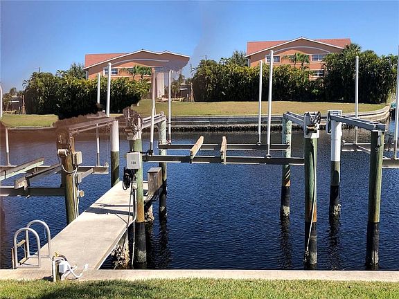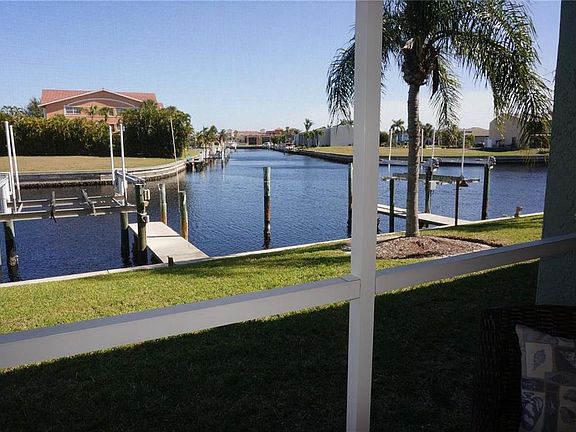 ITS ALL ABOUT BOATING! Move in ready and available NOW!!! Where are you going to find a waterfront condo with a dock and lift under $300K? !! RIGHT HERE !! And it is on a canal intersection offering beautiful water views! Charming First Floor TURNKEY-FURNISHED Waterfront Condo in Golden Sands, Punta Gorda Isles Welcome to this lovely, meticuously maintained, first-floor condo located in the highly sought-after Golden Sands community, Punta Gorda Isles. No flooding in last years storms. This move-in ready gem is offered turnkey furnished, making it perfect for those seeking a hassle-free lifestyle by the water. Located on a quiet cul de sac street filled with million dollar homes! Step inside to discover a light and bright open floor plan featuring two spacious bedrooms and two full bathrooms. The living area is enhanced with luxury vinyl plank flooring, offering a modern and durable finish. Sliding glass doors from the living room lead out to a generous 25x8 screened lanai, where you can enjoy tranquil intersecting canal views. The well-appointed kitchen features wood cabinets, Corian countertops, breakfast bar, and sleek stainless steel appliances. An adjacent inside laundry room adds convenience with a washer, dryer, and ample cabinets and shelving for storage. The master bedroom is a private retreat with direct lanai access, dual double closets, and an en-suite bathroom complete with a large walk-in shower. The guest bedroom is equally inviting, featuring two double closets, and the guest bathroom offers a tub/shower combo for added comfort. Outdoor living is a highlight of this condo. The NE facing screened lanai provides a serene spot for relaxation, with a back door leading directly to your deeded concrete boat dock (marked 12A). Boaters will appreciate the included #10,000 boat lift with ne wiring, new motors, and new controls, offering power boat access to Charlotte Harbor and the Gulf of Mexico. The community also features a heated pool for your enjoyment, and a concrete seawall maintained by the city ensures peace of mind. Additional features include a NEW metal roof (installed in 2022), hurricane shutters, crown molding, NEW lanai furniture, carpeted bedrooms, and tile flooring in the bathrooms, kitchen, and lanai. The unit also includes a grill on a concrete pad, ideal for outdoor cooking. Pet lovers will be pleased to know that this condo allows two pets up to 20 lbs each. The condo association is known for its strong financials, adding an extra layer of security to your investment. Conveniently located just minutes from golf courses, Fishermen's Village, and historic downtown Punta Gorda, you'll have easy access to shopping, dining, medical care, waterfront parks, boat ramps, fishing piers, a dog park, art galleries, and more. Enjoy walking and biking paths, weekend farmers markets, and a vibrant community atmosphere. Don’t miss the chance to own this beautiful waterfront condo in Golden Sands—schedule your viewing today!